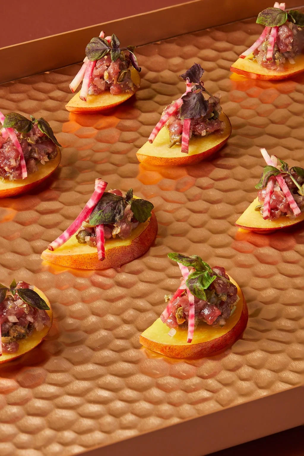 Venison tartare, umeboshi, capers, baby beetroot, micro shiso
